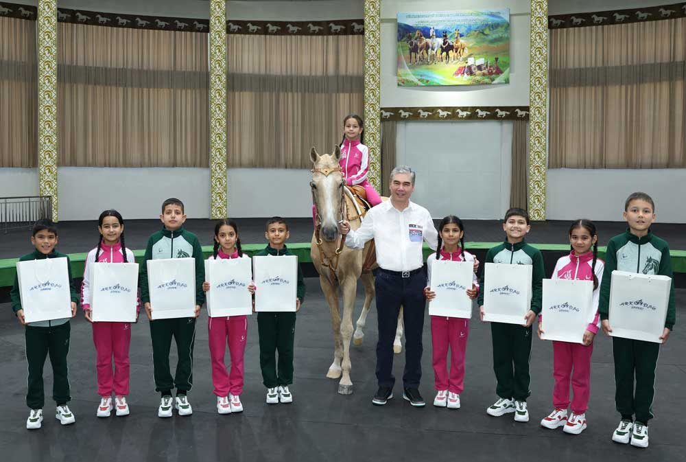 Soňra ussat atşynas Gahryman Arkadagymyz Gurbanguly Berdimuhamedow çapyksuwarlyk hünärine höwes bildirýän çagalara sowgatlary gowşurdy. Körpeler sowgatlar üçin hoşallyk bildirip, Milli Liderimizden özleri bilen ýadygärlik surata düşmegini haýyş etdiler.