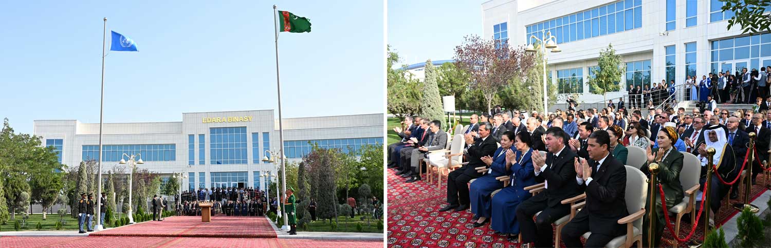 Çykyşlar tamamlanandan soňra, dabaraly ýagdaýda Türkmenistanyň we BMG-niň wekiliýetleriniň ýolbaşçylaryna, degişlilikde, ýurdumyzyň we Milletler Bileleşiginiň baýdaklary gowşurylýar. Şol wagt harby orkestr dabara sazyny çalýar. Soňra dabaraly ýagdaýda Türkmenistanyň we Birleşen Milletler Guramasynyň baýdaklary galdyryldy. Bu waka ählumumy parahatçylyga, rowaçlyga ymtylmany alamatlandyrdy.