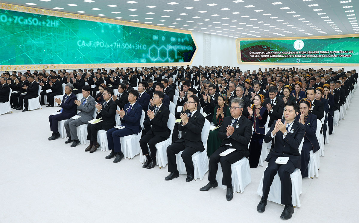 Hormatly Prezidentimiziň çykyşy şowhunly el çarpyşmalar bilen garşylanyldy. Soňra ekranda superfosfat we ammoniý sulfatyny öndürýän toplum bilen tanyşdyrýan wideofilm görkezildi.