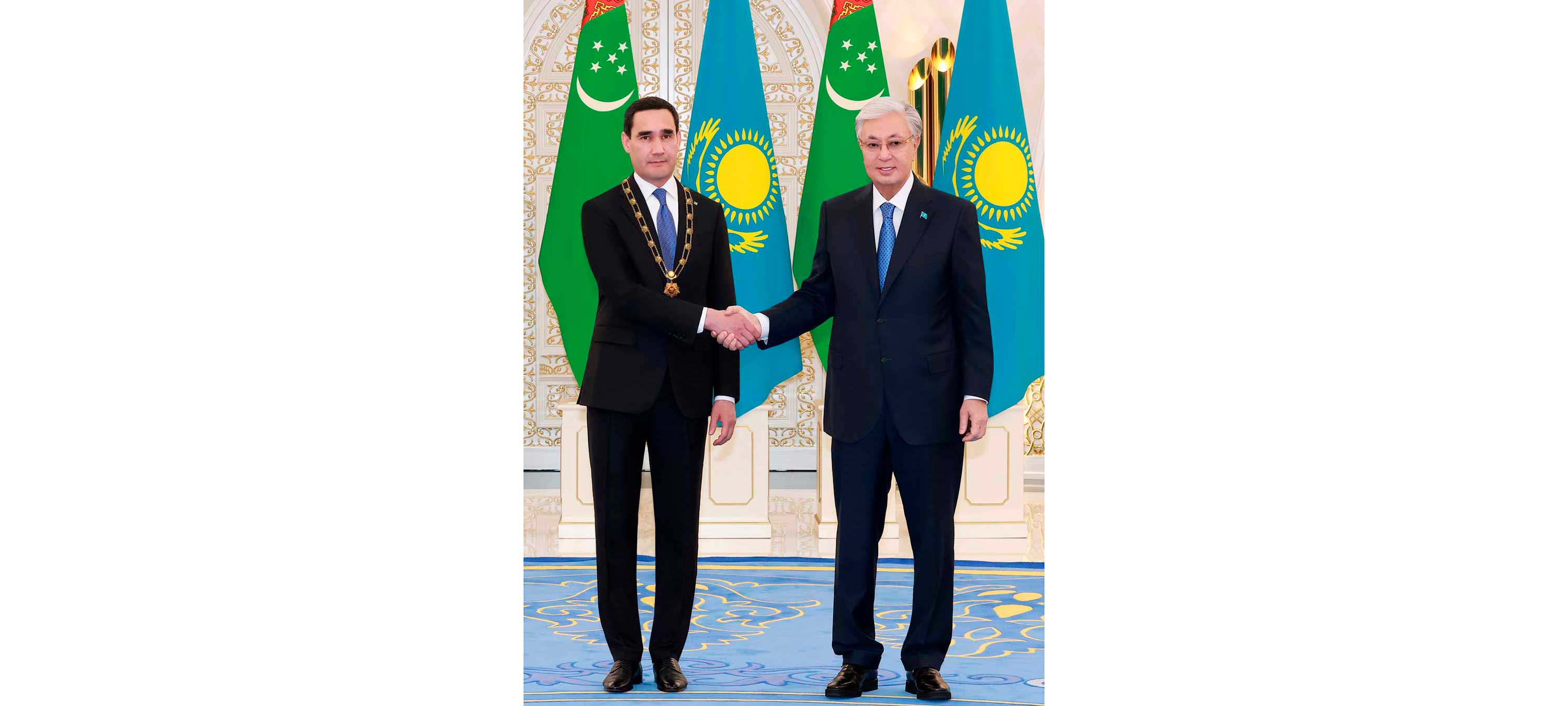 Ol hormatly Prezidentimiziň Türkmenistanyň halkara abraýyny, diplomatiýanyň, parahatçylygyň hem-de durnuklylygyň merkezi hökmünde eýeleýän ornuny pugtalandyrmak boýunça edýän tagallalary barada aýratyn durup geçdi. Türkmenistanyň başlangyjy boýunça BMG-niň Baş Assambleýasy tarapyndan 2025-nji ýylyň “Halkara parahatçylyk we ynanyşmak ýyly” diýlip yglan edilmegi munuň aýdyň mysalydyr. Prezident Kasym-Žomart Tokaýew iki ýurduň arasynda dostlugy, özara düşünişmegi we strategik hyzmatdaşlygy berkitmekde döwlet Baştutanymyzyň şahsy goşandyny belläp, şu günki gepleşikleriň netijeleri boýunça gazanylan ylalaşyklaryň üstünlikli durmuşa geçirilmeginiň gazak-türkmen gatnaşyklarynda täze sahypany açjakdygyna ynam bildirdi hem-de döwlet Baştutanymyzy Gazagystan Respublikasynyň iň ýokary sylagy — “Altyn Kyran” ordeni bilen sylaglady.
