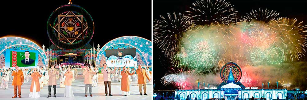 Meşhur aýdymçylar Watanymyzyň täze taryhy eýýamyny wasp edýän aýdym-sazlary ýerine ýetirdiler. Ähli çykyşlar ajaýyp horeografik kompozisiýalar bilen utgaşdyryldy. Munuň özi baýramçylyga aýratyn öwüşgin çaýdy. Alypbaryjylar bu ýere ýygnananlaryň ählisiniň adyndan Gahryman Arkadagymyzy we hormatly Prezidentimizi Täze ýyl baýramçylygy bilen gutlap, berk jan saglyk, bagtyýarlyk, Watanymyzyň rowaçlygynyň bähbidine amala aşyrylýan özgertmeleriň üstünliklere beslenmegini tüýs ýürekden arzuw edýärler.