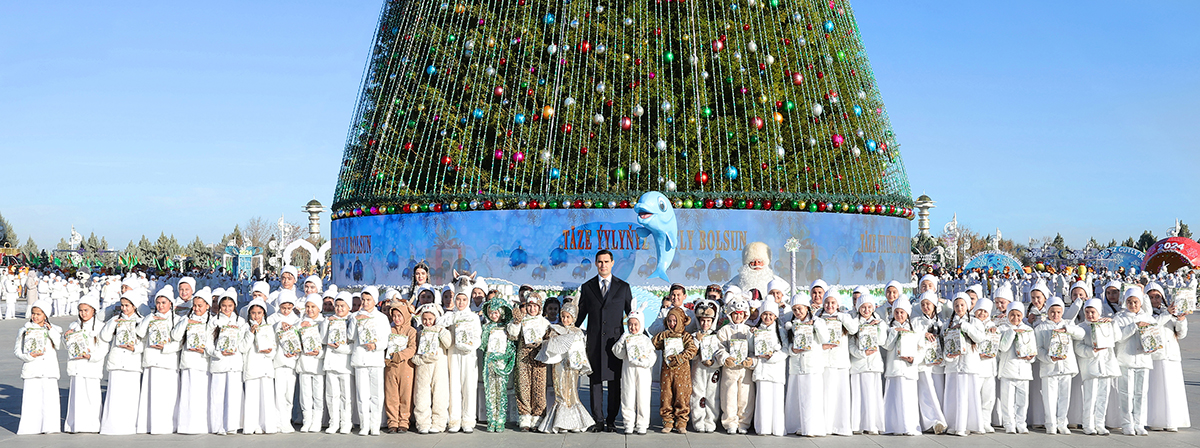 Bu ýerde Täze ýyl baýramçylygynyň baş gahrymanlary Aýazbaba we Garpamyk hem-de tamamlanyp barýan 2023-nji ýylyň nyşany bolan towşanyň we ýetip gelýän 2024-nji ýylyň nyşany bolan luwuň keşbine giren çagalar türkmenistanlylaryň, ýaş nesilleriň adyndan Arkadagly Gahryman Serdarymyzy Täze ýyl bilen gutladylar. Şeýle hem çagalar barada edýän atalyk aladalary, olaryň kämil we köpugurly bilim almagy, ýaş nesilleriň sazlaşykly ösmegi, watansöýüjilik ruhunda terbiýelenmegi ugrunda döredilýän şertler üçin tüýs ýürekden hoşallyklaryny beýan etdiler. Olaryň öňünde ýakyn geljekde Watanymyzy täze belent sepgitlere çykarmak wezipesi durýar.