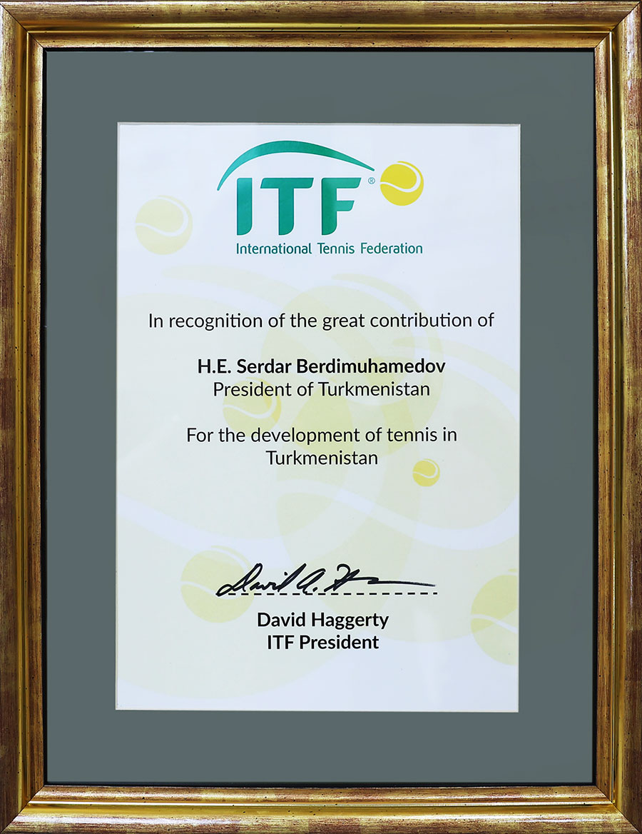 Jenap Dewid Haggerti Türkmenistanda bu ugurda uly üstünlikleriň gazanylandygyny belläp, hormatly Prezidentimiz Serdar Berdimuhamedowa Halkara tennis federasiýasynyň güwänamasyny gowşurdy.